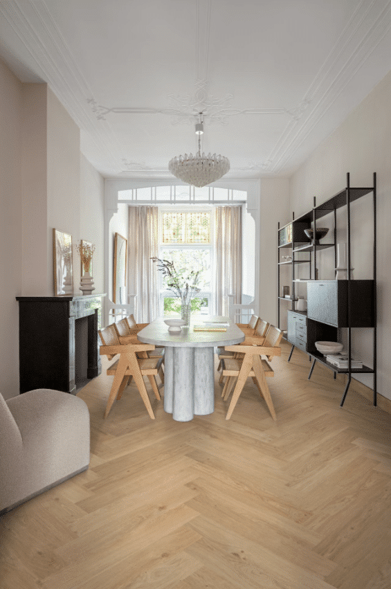 L’installation de ce parquet en bâton rompu est simplifiée grâce à un système de clic ingénieux, permettant une pose facile aussi bien pour les bricoleurs que pour les professionnels, malgré la complexité apparente du motif. Ce revêtement polyvalent s’adapte parfaitement aux projets de rénovation comme aux constructions neuves, faisant de lui un choix privilégié pour ceux qui souhaitent allier le charme sophistiqué du parquet en bâton rompu traditionnel aux avantages du vinyle moderne.