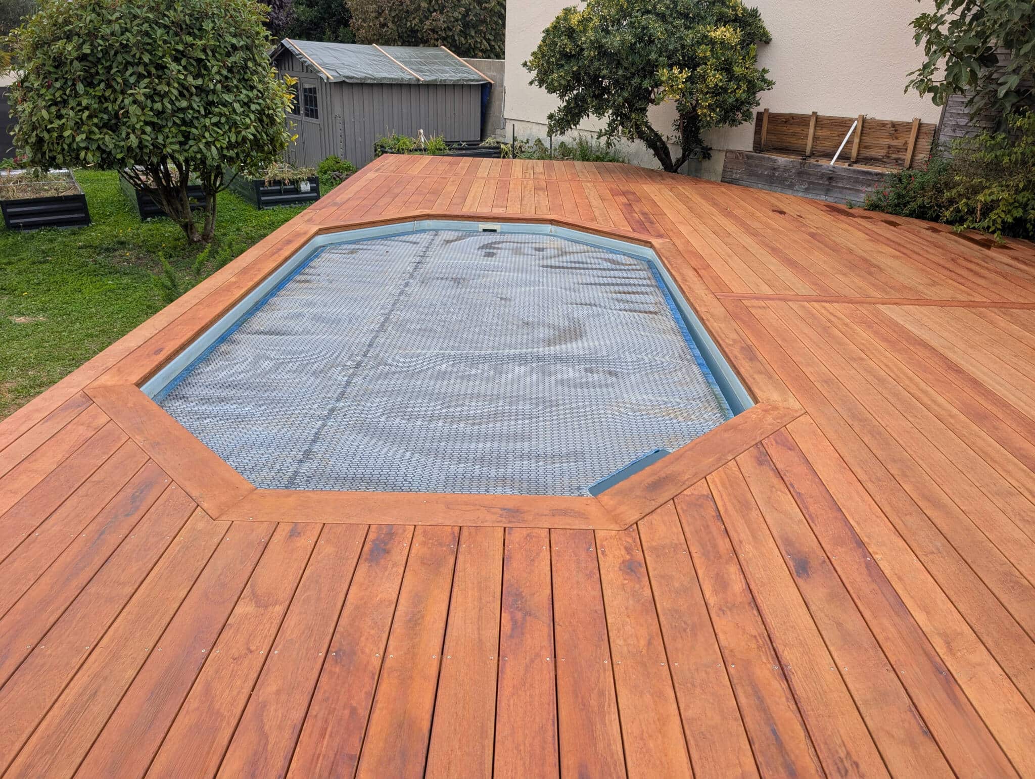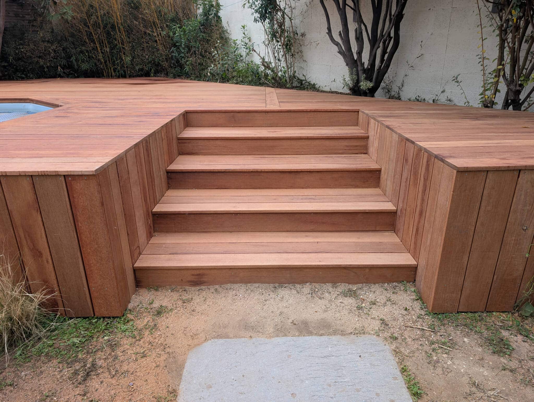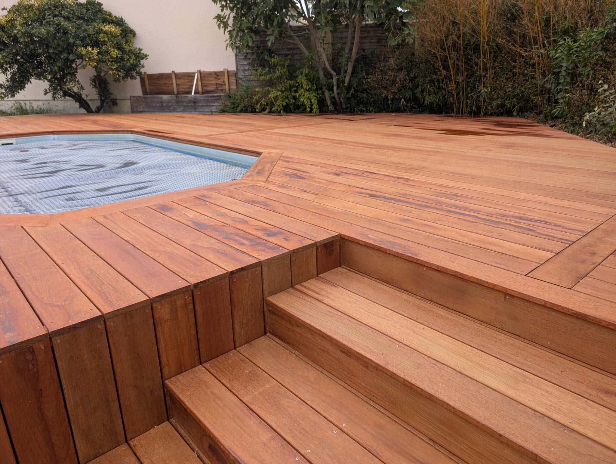 Originaire d’Asie du Sud-Est (Indonésie, Malaisie), ce bois se distingue par sa teinte brun-rouge caractéristique aux nuances orangées qui s’intensifie à la lumière, apportant une touche chaleureuse à votre terrasse ou à votre contour de piscine.